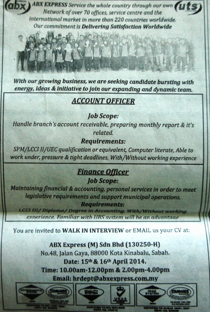 Sabah Vacancy 2014 Abx Express M Sdn Bhd Kota Kinabalu Account Officer Finance Officer Job Vacancy In Sabah
