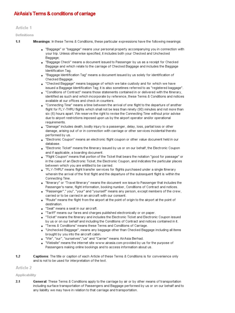 Airasia Terms And Conditions Of Carriage Baggage Identity Document