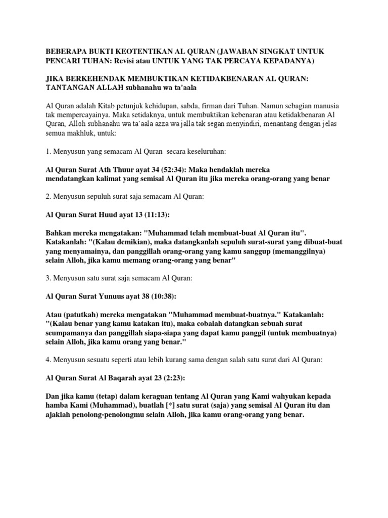 Namun ketiga bukti keotentikan al qura an ini setidaknya dapat dijadikan sebagai bekal dalam meyakini dan mengimani kebenaran al qura an sebagai firman allah swt yang diturunkan kepada nabi muhammad saw melalui malaikat jibril. Muhammad telah membuat buat al quran itu. Sangat keterlaluan sekali jika sebagai umat islam kita tidak tahu apa al qur an itu.