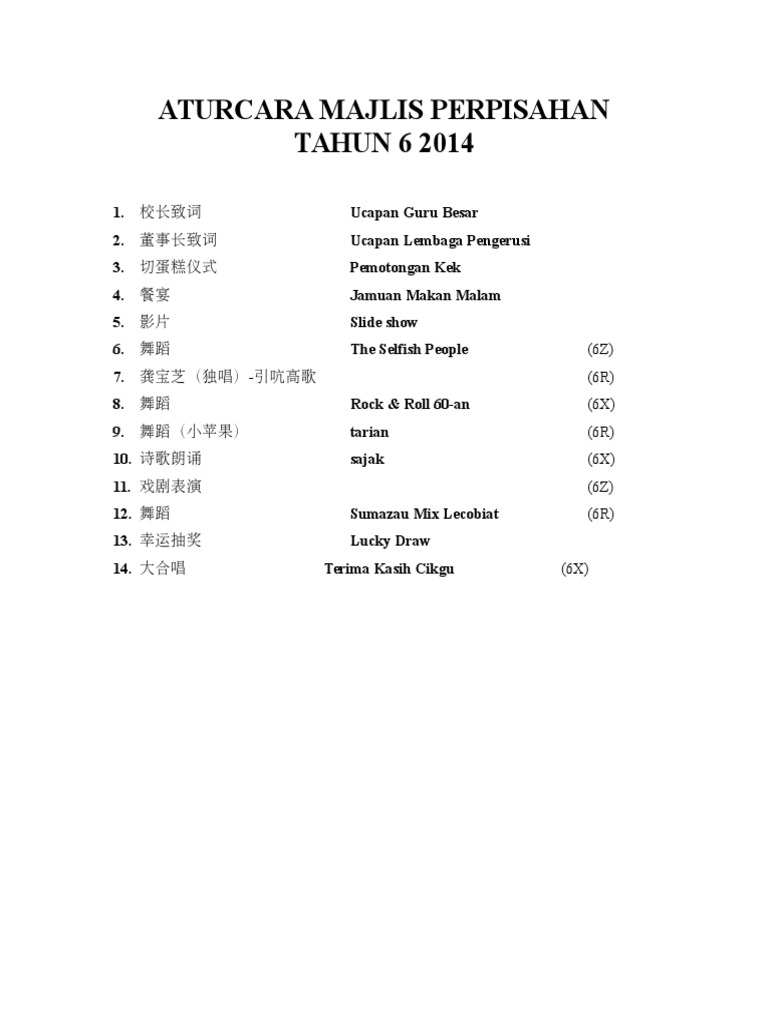 Aturcara Majlis Perpisahan Tahun 6 2014