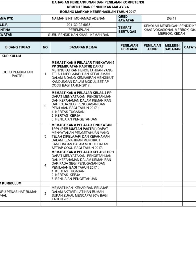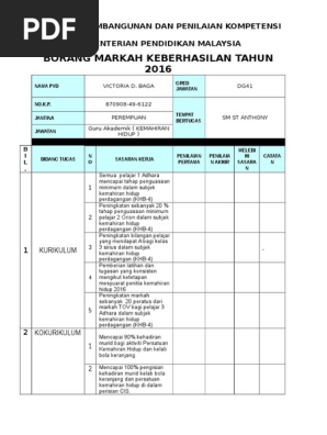Bahagian Pembangunan Dan Penilaian Kompetensi Kementerian Pendidikan Malaysia Borang Markah Keberhasilan Tahun 2016 Nama P Guru Fails