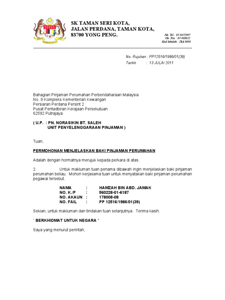 Surat Menyelesaikan Baki Pinjaman