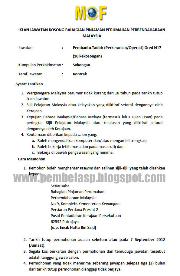 Pembela Iklan Jawatan Kosong Bahagian Pinjaman Perumahan Perbendaharaan Malaysia