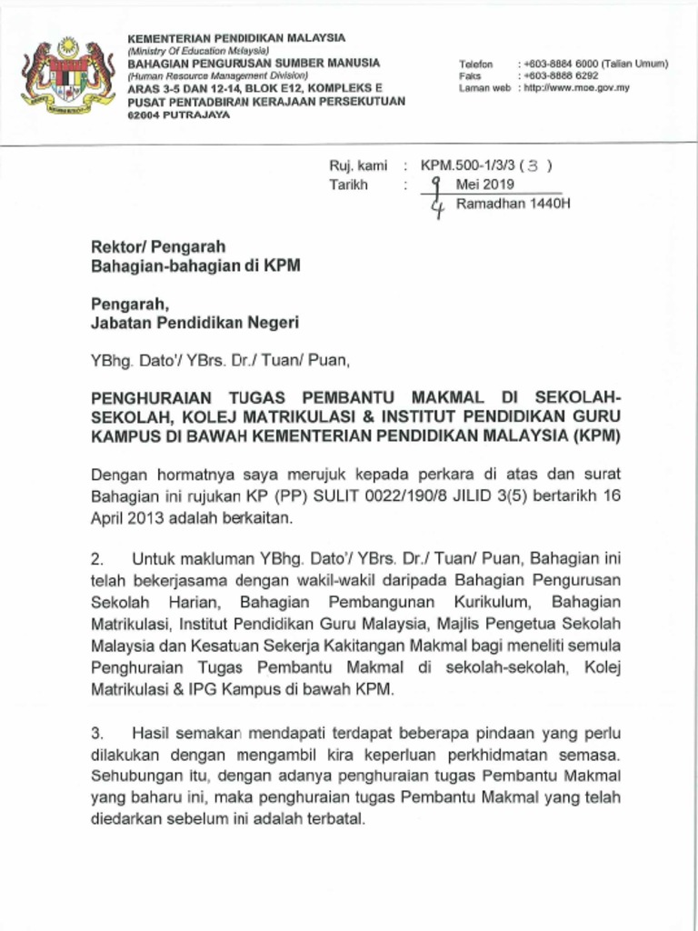 Edaran Penghuraian Tugas Pembantu Makmal Di Sekolah Kolej Matrikulasi Ipgm Kampus Di Bawah Kpm