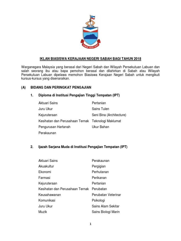Iklan Biasiswa Kerajaan Negeri Sabah Bagi Tahun 2018