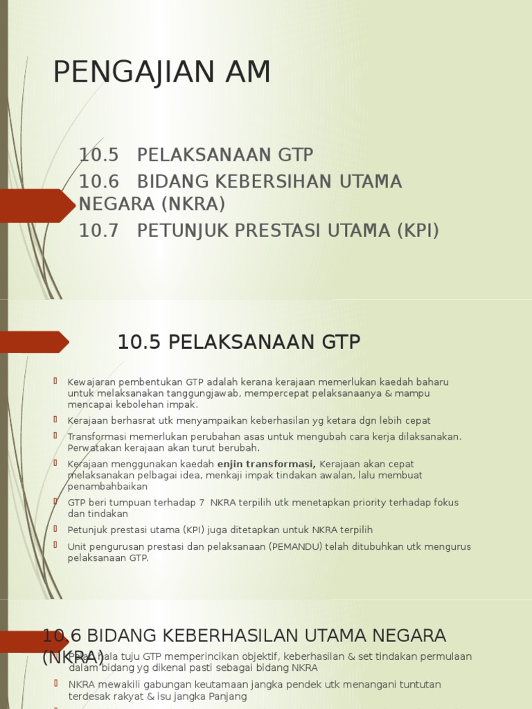 Pengajian Am 10 5 Pelaksanaan Gtp 10 6 Bidang Kebersihan Utama Negara Nkra 10 7 Petunjuk Prestasi Utama Kpi