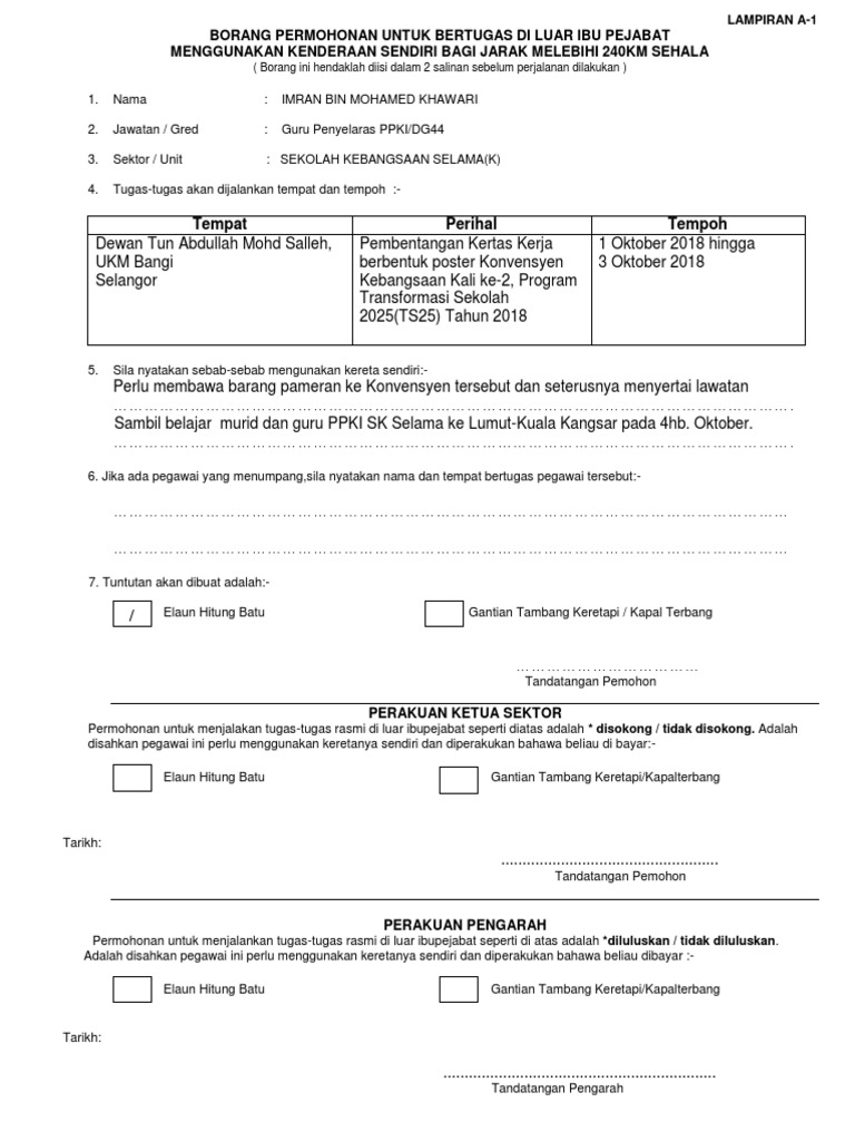 Borang Menggunakan Kenderaan Sendiri Melebihi 240km