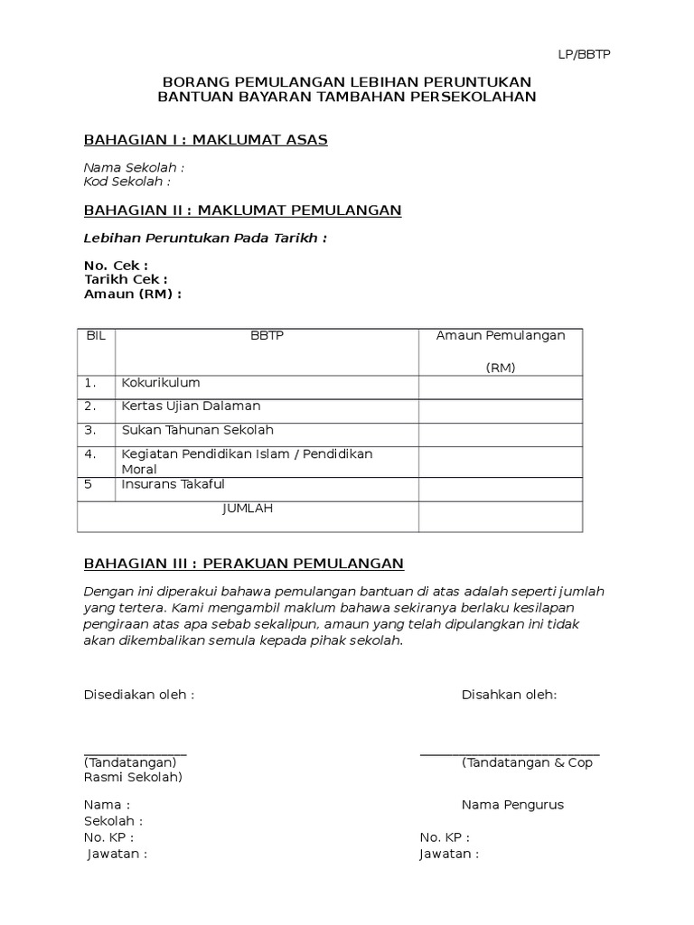 Borang Pemulangan Lebihan Peruntukan Bantuan Persekolahan