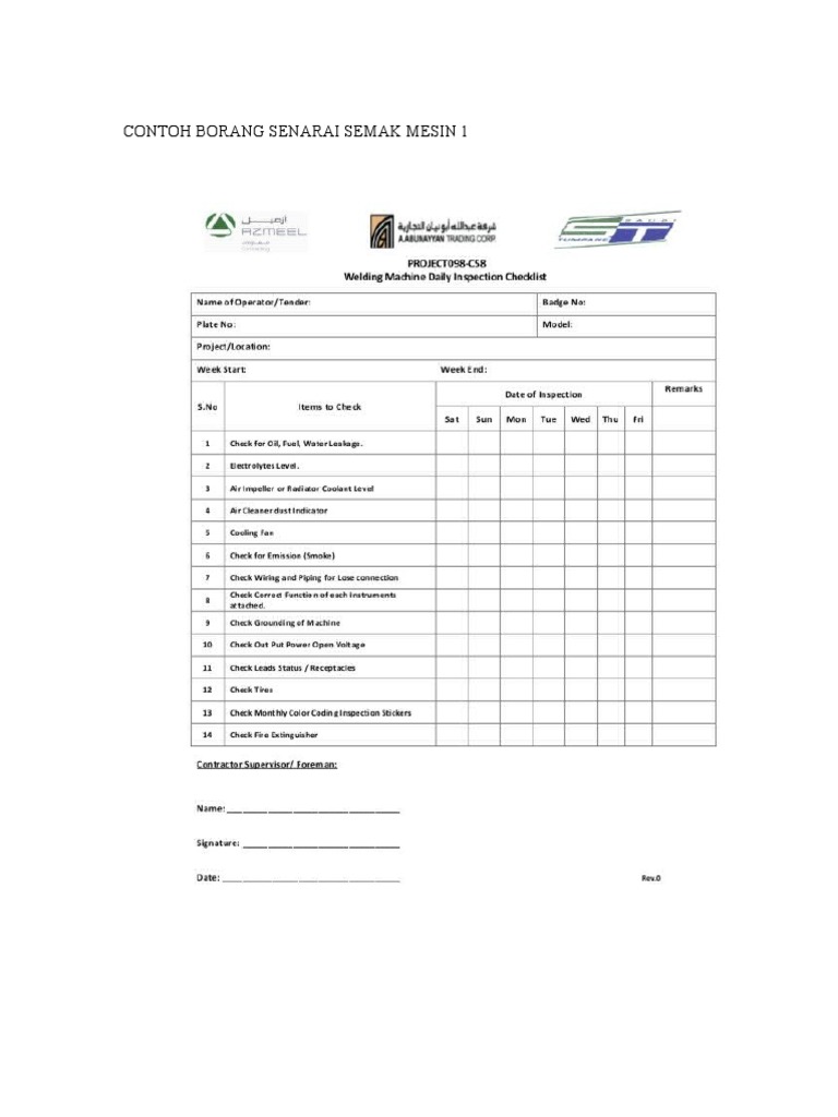 Contoh Borang Senarai Semak Mesin 1 Doc