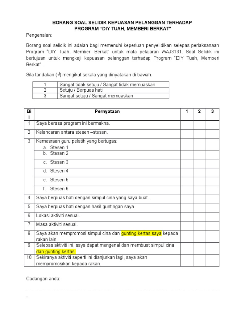 Borang Soal Selidik Kepuasan Pelanggan Terhadap Docx